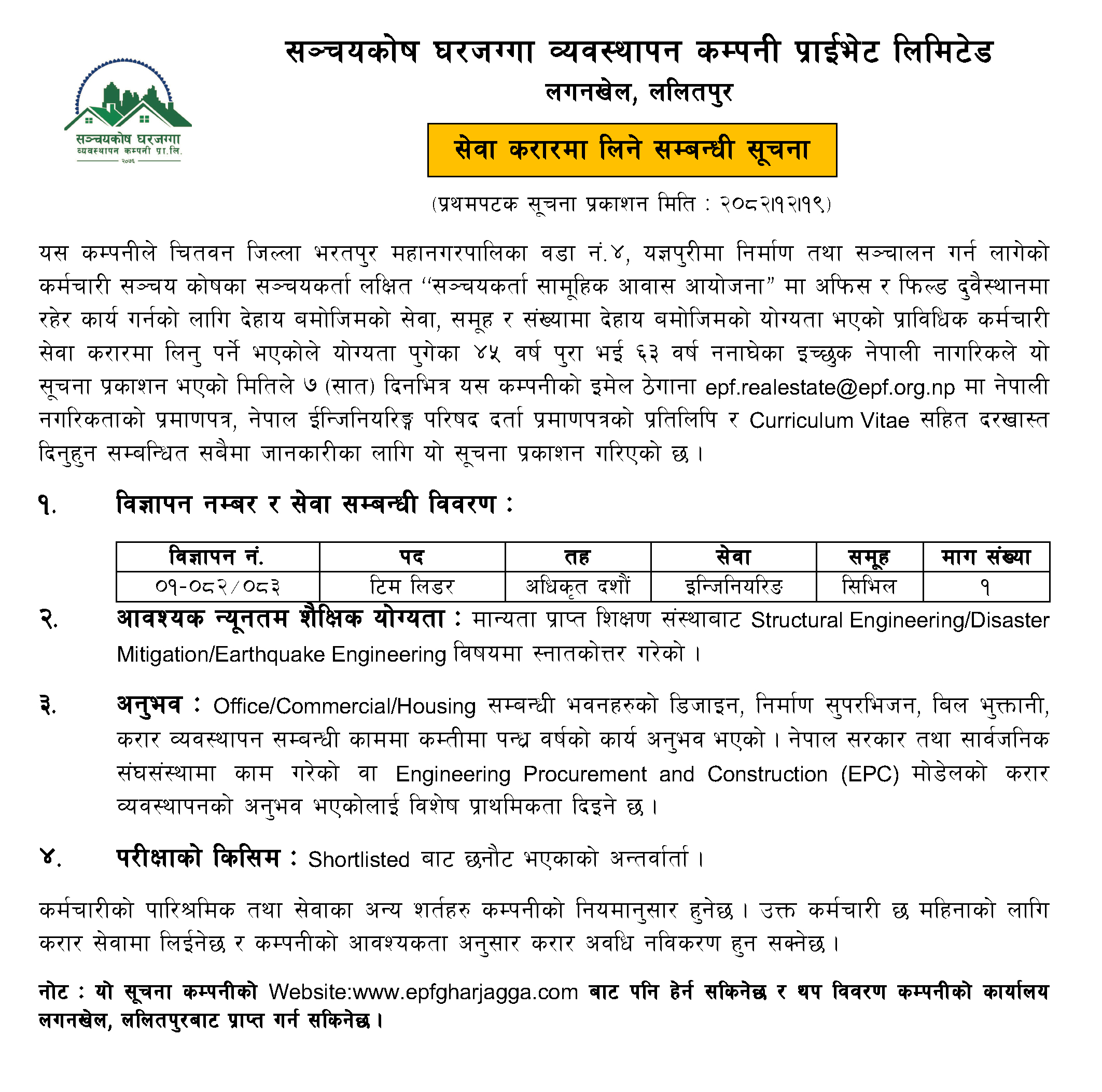Notice regarding taking service on contract